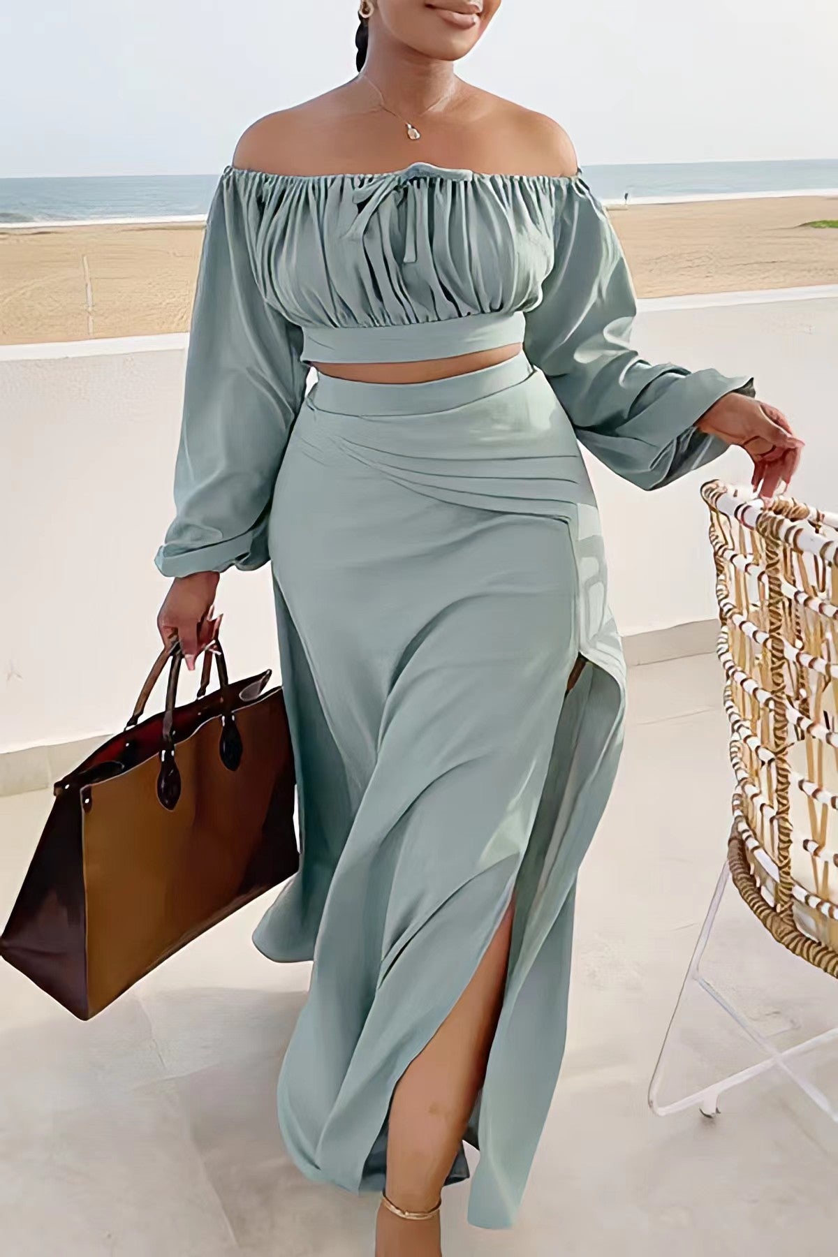 Off Shoulder Ruched Blouse & Split Thigh Skirt Set$45.59 USD$55.99 USD