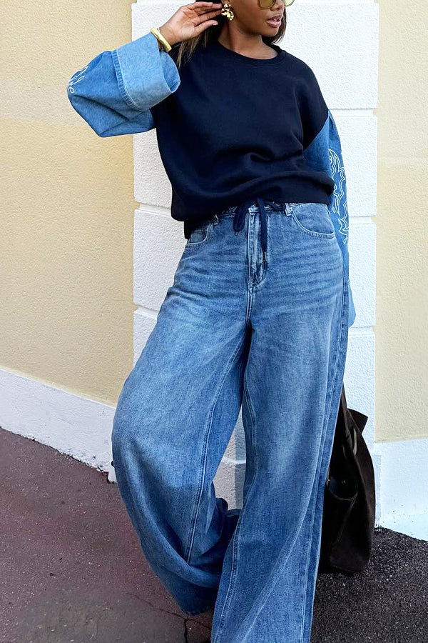 Chic Floral Embroidered Denim Patchwork Sweatshirt
