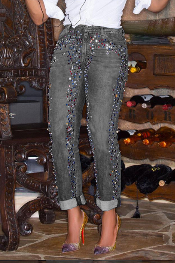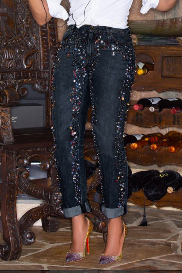 STUNNING✨ // The jean adorned with a stunning array of colorful, gem-like embellishments arranged throughout the front. The jewels come in various shapes and vibrant colors, creating an eye-catching, glamorous look. The embellishments run vertically along the pant legs, accentuating the curves and adding sparkle.