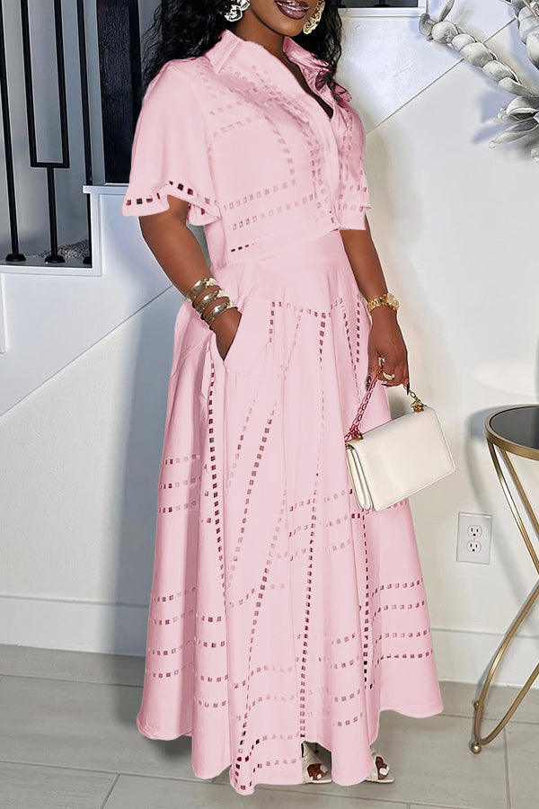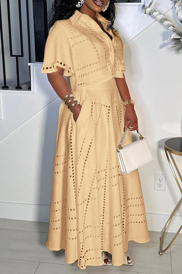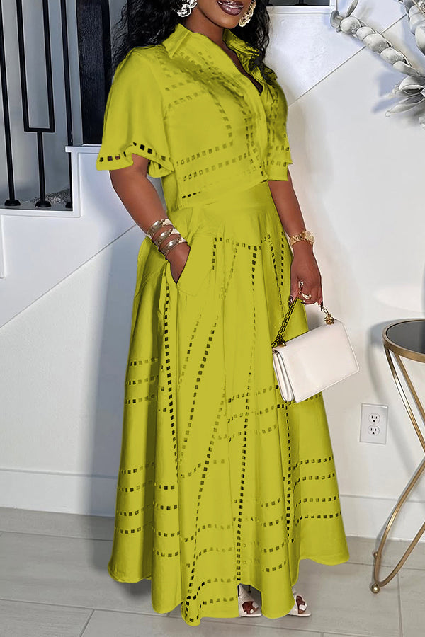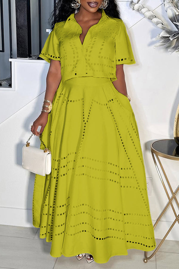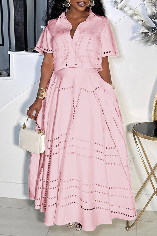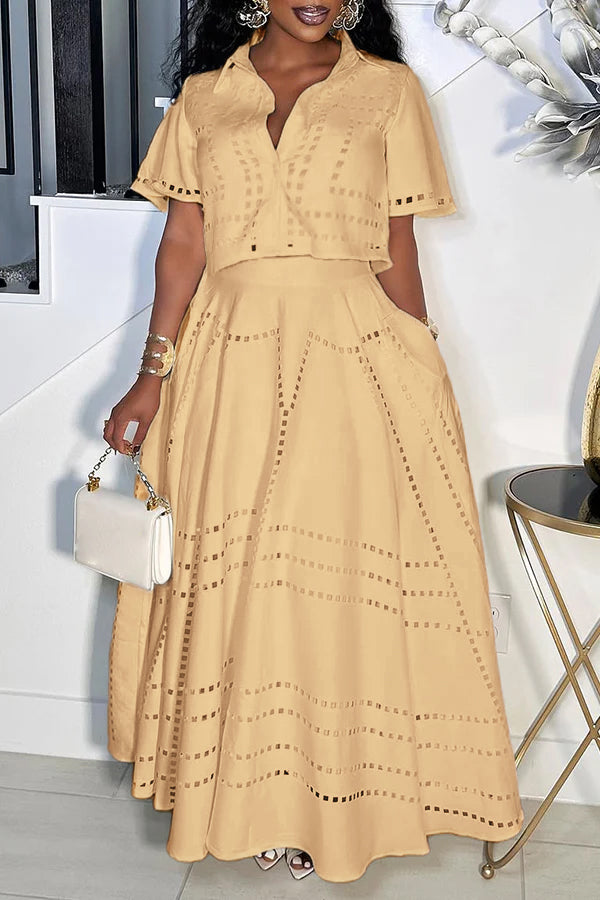 This set is giving major summer magic! The cropped button-up top with its cute collar and fun cutout details is all about easy, breezy vibes. The matching high-waisted maxi skirt twirls like a dream, keeping the whole look flirty, fresh, and ready for wherever the day (or night) takes you!