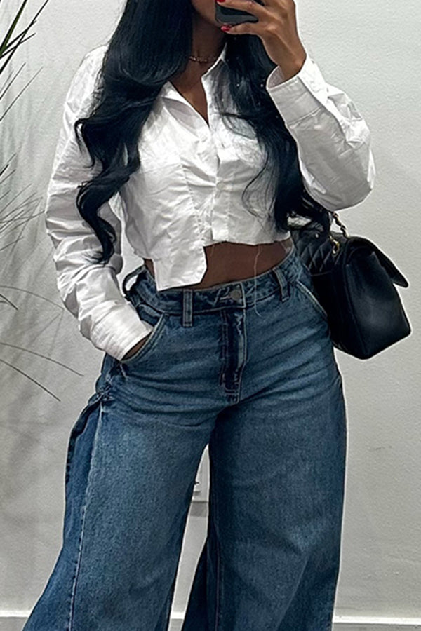 The jeans shown are high-waisted with an ultra-wide leg design. Feature unique side slits that open up along the outer seams. The hem is unfinished with a slightly frayed edge, enhancing the casual vibe.